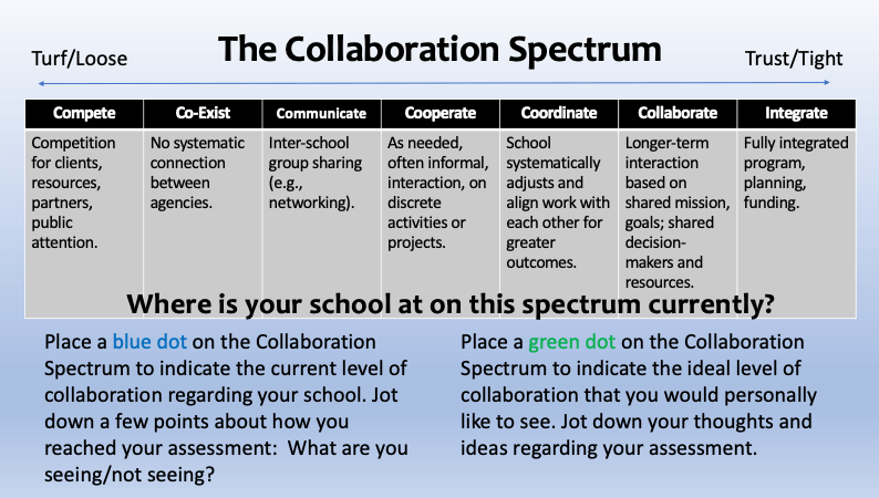 All schools’ collaborate in varying degrees. When working with schools, I like to post a collaboration visual and ask them where they think they are currently at in terms of collaboration and, secondarily, where they aspire to be. Invariably the responses for where they think they are now are all over the place. It’s always noteworthy that their perceptions are not aligned with one another. But when asked where they aspire to be on the continuum, it is always to have more interaction and be on the far right of the diagram with the highest form of collaboration possible. I interpret this to mean that teachers are yearning to be less isolated and want more collegial engagement. So, the question becomes what is blocking the realization of a more collaborative school environment and how can they get there?