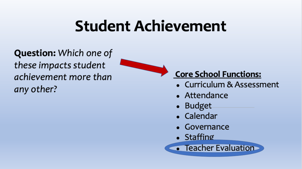 Finally, let’s look at what all schools have in common are it’s core functions. They normally include curriculum and assessment, attendance, budget, calendar, governance, staffing, and teacher evaluation. When it comes to student achievement, the most important goal for any school, which one of them do you think has the greatest potential impact? I would argue it is teacher evaluation. Why? Simply due to the fact that teachers, the greatest resource of any school, have a direct and ongoing relationship with students in the teaching of content and skills and therefore have the largest impact on student learning. Teacher evaluation systems can, if designed correctly with the proper structures and processes that are grounded in teacher support and empowerment, can yield the greatest benefit to student achievement.