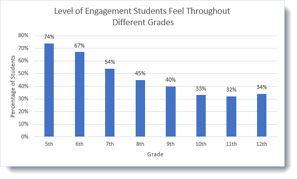 Students who are engaged are more hopeful for the future and are more likely to perform better in school. Hope is the belief that the future will be better than the present, coupled with the belief that you have the power to make it so. Students who are disengaged tend to feel discouraged about their future and begin to lack hope. When students begin to lack hope, they tend to disengage impacting their academic performance. We know that engagement is linked to student success, yet student engagement drops significantly from elementary to high school. While 74% of fifth-grade students find school engaging, that number drops to 34% for 12th graders in what Gallup calls the student engagement cliff.